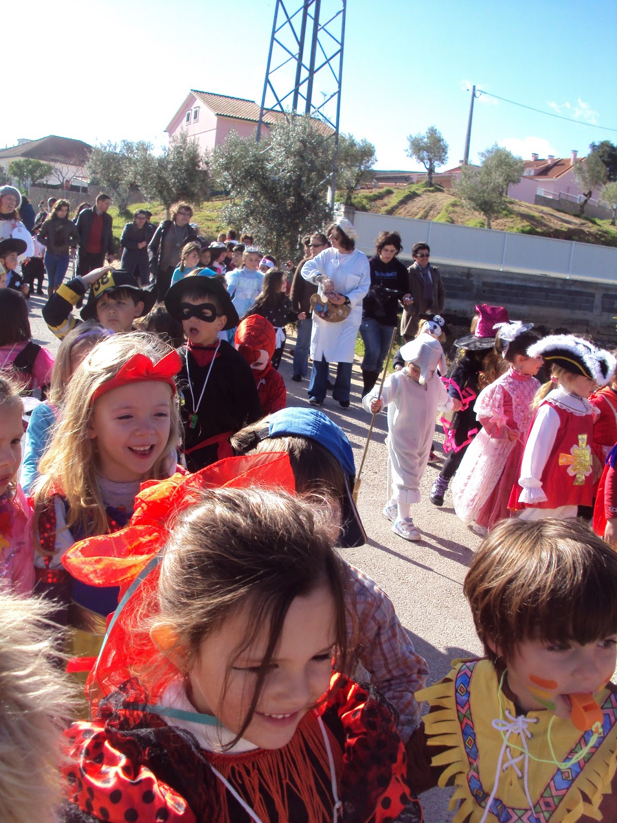 Hoje vivemos uma manhã diferente e muito divertida. Já há muito que tínhamos combinado os nossos disfarces. Como este ano temos falado muito de castelos, palácios, reis, rainhas, princesas, fadas e etc, o imaginário das crianças andou à volta disso. Depois com as guerras e as lutas dos nossos reis foram ainda introduzidos os soldados e os cavaleiros. Inicialmente cada criança pensou no seu disfarce preferido. Depois as crianças de cinco anos desenharam o disfarce que queriam. Os mais novos escolheram-no apenas. Depois fiz reunião com os Pais e contei-lhes o que já tinha combinado com as crianças. Sugeri-lhes ir à arrecadação do Jardim-de-infância e ver o que lá tínhamos e poderíamos reutilizar e adaptar. Os pais concordaram com a sugestão. Era barata e não exigia trabalho extra, duas grandes vantagens nos tempos que correm. Com as crianças realizei os acessórios ( coroas, fatos dos soldados, chapéus de fada, etc), a Ana andou de volta das capas (usámos as dos reis magos, transformámos o manto da Nossa Senhora, uns cortinados velhos também serviram) e com a ajuda das crianças foram decoradas a gosto. A maioria das saias foram feitas há alguns anos para as mães participarem numas marchas…deu muito jeito serem compridas como as das princesas. Hoje foi só vestir as roupas já preparadas, pintar as carinhas das princesas, as barbas e os bigodes dos reis e dos soldados. Depois eu disse que a corte ia dar um passeio à floresta pois já sabia que o professor Octávio tinha preparado com os alunos do 1º CEB disfarces de árvores.
