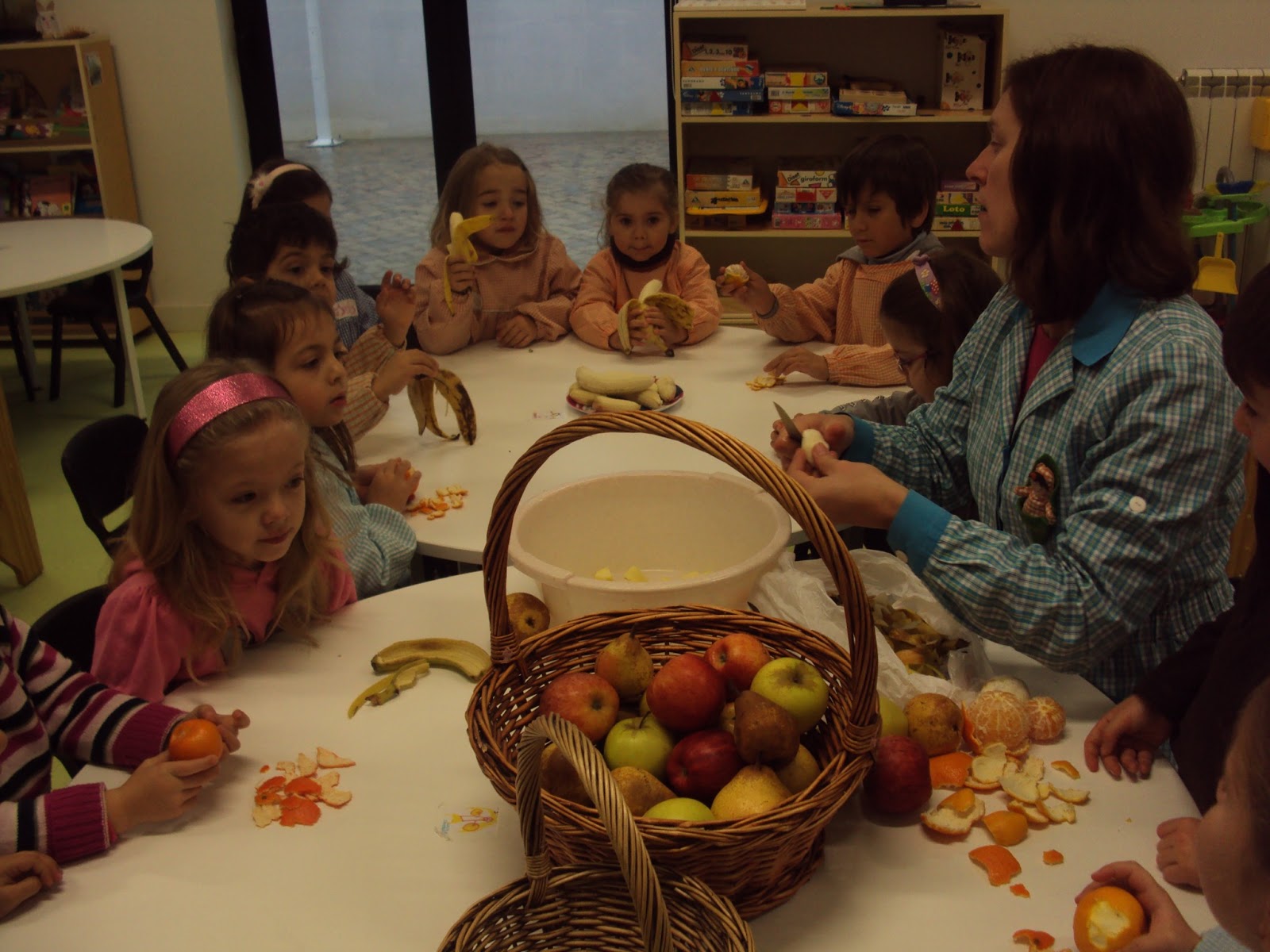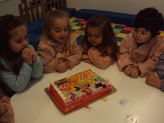As novidades continuaram a um ritmo tão rápido que nem registámos mais...depois foi sugerido que alterássemos o lugar nas almofadas conforme estava combinado antes de ir-mos de férias. O Filipe, que hoje foi o responsável, foi o primeiro a escolher e depois seguiram-se os outros meninos, dos mais velhos para os mais novos. De seguida cantámos os parabéns às nossas Lauras que fizeram anos durante as férias. O bolo foi o mesmo mas o mais importante foi cantarmos-lhe os parabéns e apagarem as velas. Continuámos a "ser heróis da fruta" como não podia deixar de ser. Ainda combinámos fazer as coroas dos Reis que estão a ficar mesmo "reais".