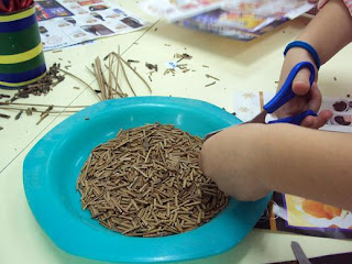 Hoje estava um lindo dia de Outono. Queríamos fazer digitinta (fofinha e bem cheirosa). Aproveitámos e fizémos na rua, dois de cada vez. Misturámos espuma de barbear com tinta e depois mexer lá foi uma delícia.