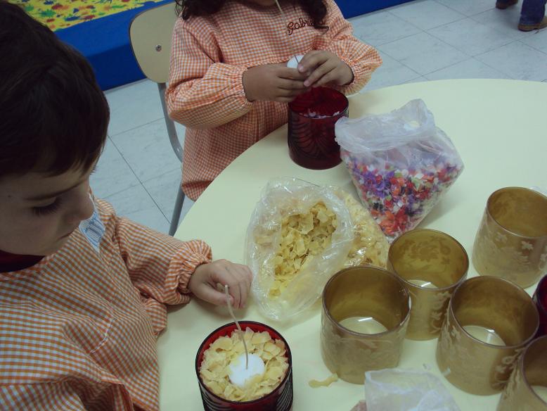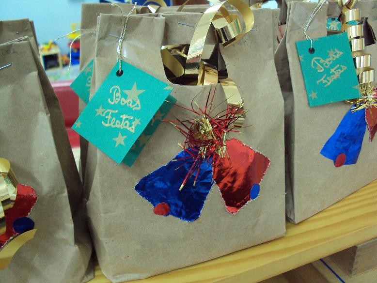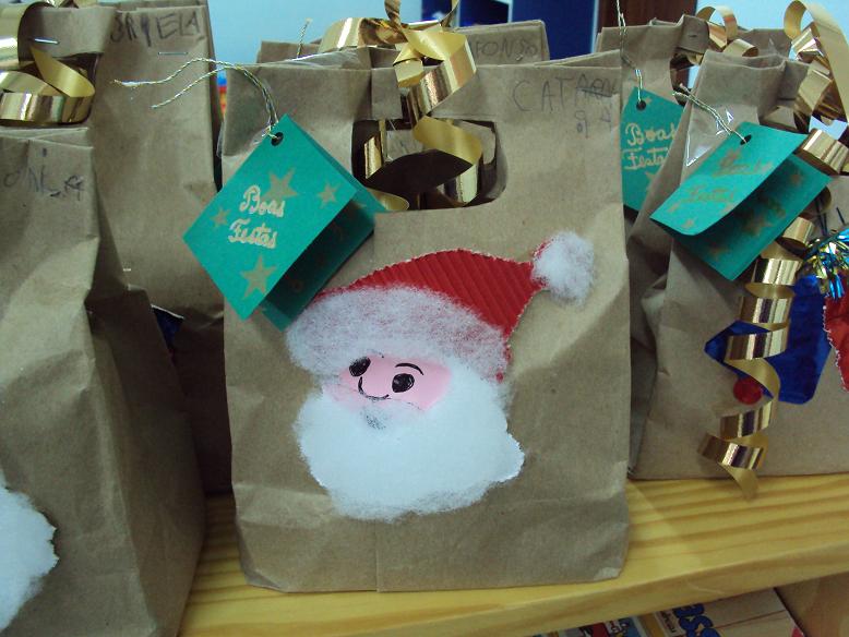 Este ano para oferecermos aos pais fizémos uma vela muito simples. Tínhamos copos, (com alguns defeitos que nos trouxeram as mamãs que trabalham na fábrica de velas), raspas de cera com cheiirinhos agradáveis e pavios. Foi só colocar isto tudo no copo e a prendinha ficou pronta. O saco onde a levámos deu um pouquinho mais de trabalho mas também ficou bonito com a cara do Pai Natal de um lado e uns sininhos do outro. O papel é reutilizado das sacas de farinha que nos trouxeram o Afonso e o Ivo.