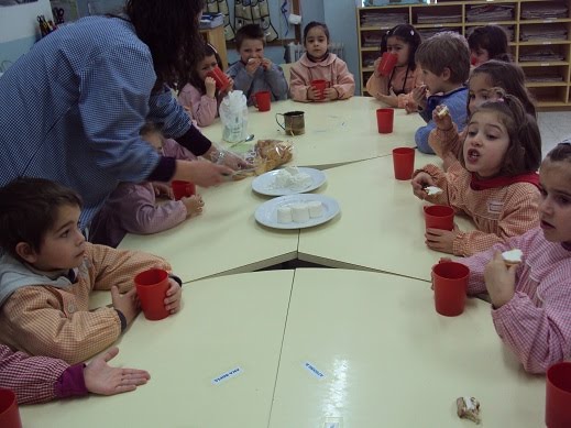 Hoje o nosso lanche da manhã foi mesmo especial. Tostas com queijo fresco e requeijão (do que fizemos ontem na nossa sala). Alguns meninos preferiram pão com queijo. Para beber um maravilhoso chá calmante.