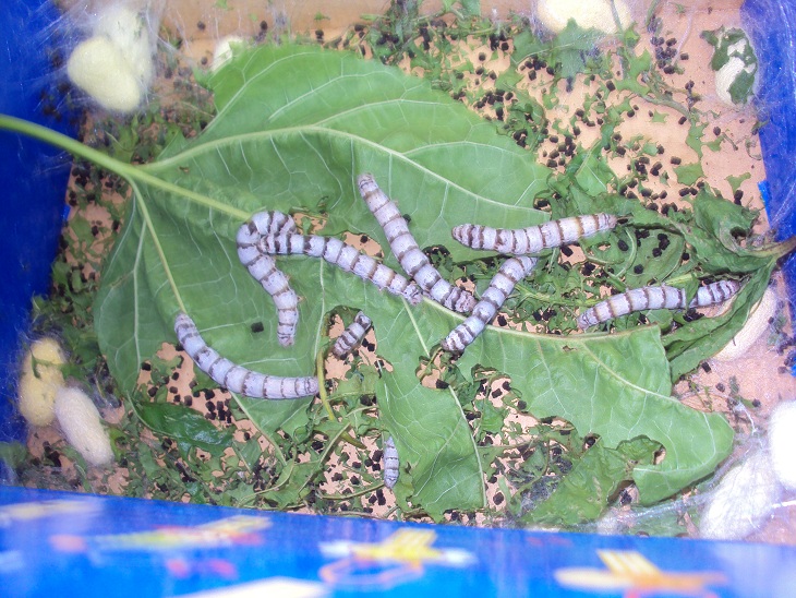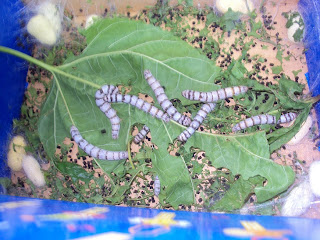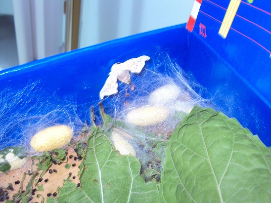 Depois de terem comerem muitas folhinhas de amoreira e de terem crescido muito o ciclo dos nossos bichos da seda aproxima-se do fim. Ainda que alguns bichinhos ainda não tenham construído o seu casulo, hoje descobrimos a primeira borboleta.Depois de pôr os seus ovos vai morrer porque ela não come.