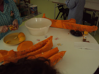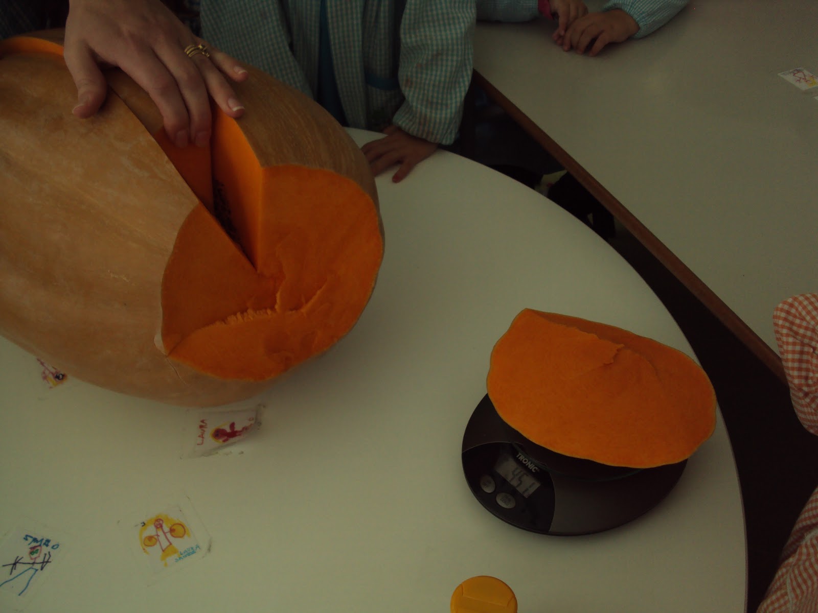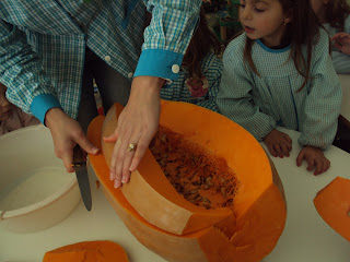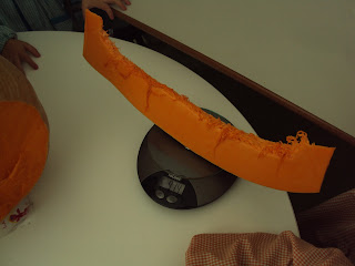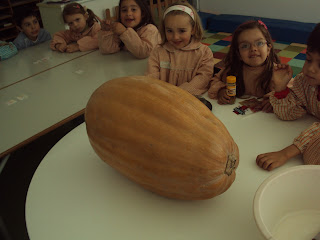 A mãe da Ana Sofia deu-nos uma abóbora muito grande e pesada. Queria-mos saber o peso da abóbora mas a nossa balança de cozinha só pesava, no máximo, 2 kg de cada vez. Então começámos a pensar "com a cabecinha" para arranjar-mos uma solução. As sugestões foram muitas e a discussão (no bom sentido) também. "Não se pode pesar" disseram uns, outros sugeriram que se pesasse na balança onde se pesaram os meninos (mas essa não estava na escola). Alguém disse que se podia pesar se fosse partida em bocados ...e assim fizemos. Juntando o peso de cada bocado de abóbora chegámos à conclusão que abóbora pesava aproximadamente 20 kg. Depois viram que a abóbora era mais pesada que alguns meninos e alguns meninos eram mais pesados que a abóbora (o peso dos meninos varia entre os 15 kg e os 29 kg).