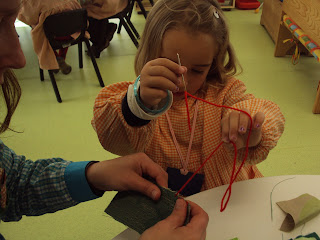 Iniciámos hoje outro novo projeto que vamos concretizar em conjunto com os amigos da sala nº 7. O primeiro passo foi juntar quadrados, retângulos e triângulos de tecido por isso alguns meninos experimentaram ser costureiros (e com muito jeitinho)!