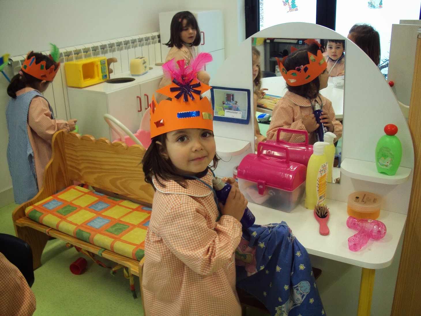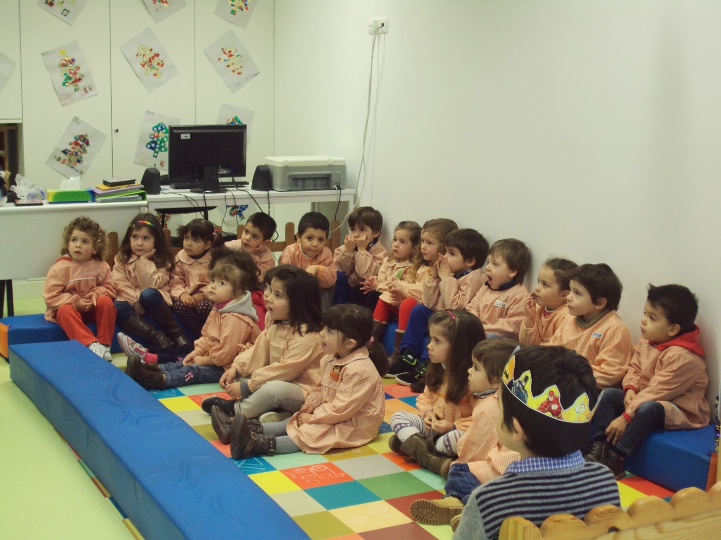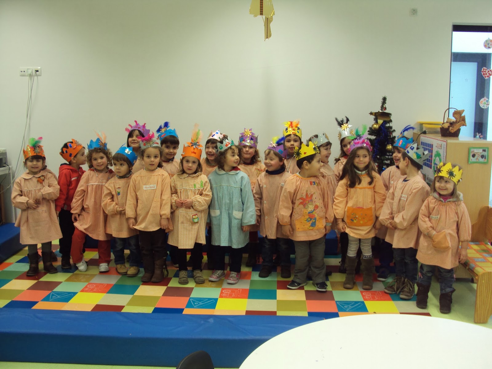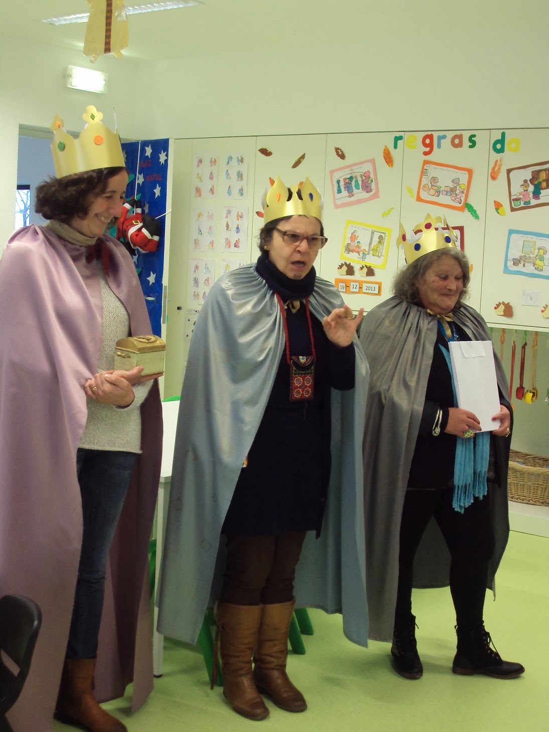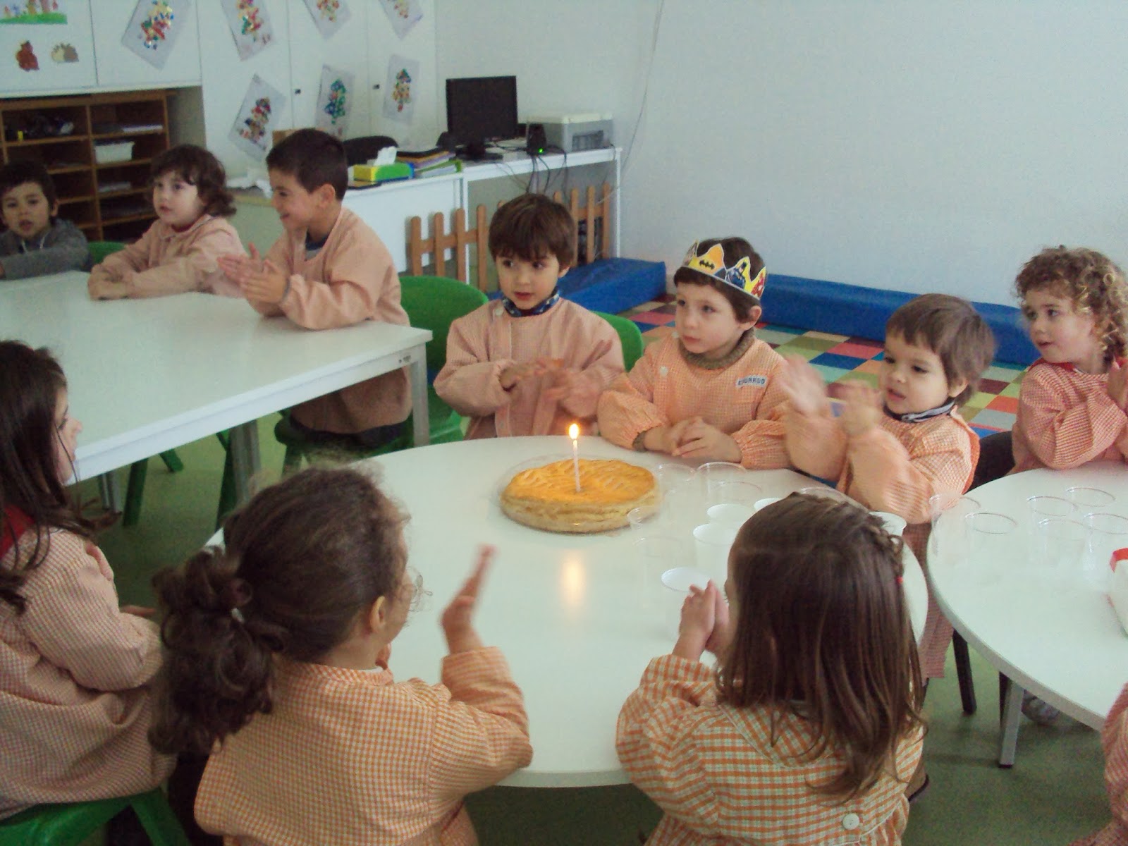 E hoje recomeçámos a nossas atividades com um dia muito preenchido. Depois de conversarmos sobre as férias recebemos a visita dos três Reis Magos (de faz de conta). A prof. Natércia da biblioteca em conjunto com a Prof. Maria do Carmo e com a Susana vieram-nos contar a história dos três Reis Magos e nós escutámos com muita atenção. De seguida tivemos um lanche especial, festejámos o aniversário do Eduardo que fez 4 anos nas férias. O bolo foi adequado ao dia de hoje (dia de Reis) e como muitos meninos não gostam de bolo rei comemos um bolo de origem francesa "Galette de Rois" acompanhado por xarope de groselha. Depois ouvimos e tentámos aprender uma canção dos reis (partilhada através da página " O resto são cantigas" - obrigada Alda). Ainda combinámos fazer coroas, uma para cada menino(a) da cor e forma (haviam dois modelos) que cada um escolheu. Foi necessário recortar e enfeitar e já está. Ah...ainda brincámos na sala pois as saudades eram muitas.