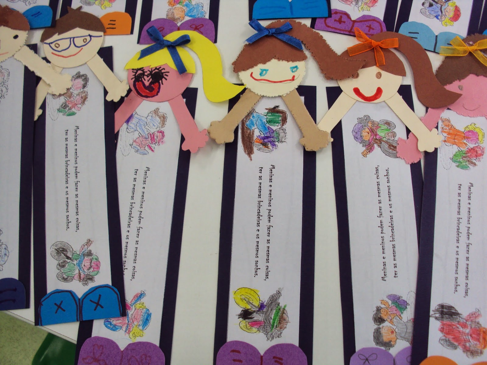 Depois da sessão de sexta-feira com a história da "Princesa Espertalhona" voltamos a conversar sobre as coisas que meninos e meninas podem e devem fazer mais concretamente sobre a igualdade de géneros. A Biblioteca escolar lançou-nos um desafio: fazer um marcador de livros onde estava escrita a seguinte mensagem "Meninas e meninos podem fazer as mesmas coisas, ter as mesmas brincadeiras e os mesmos sonhos". Hoje concluímos os nossos marcadores de livros que ficaram bem engraçados.