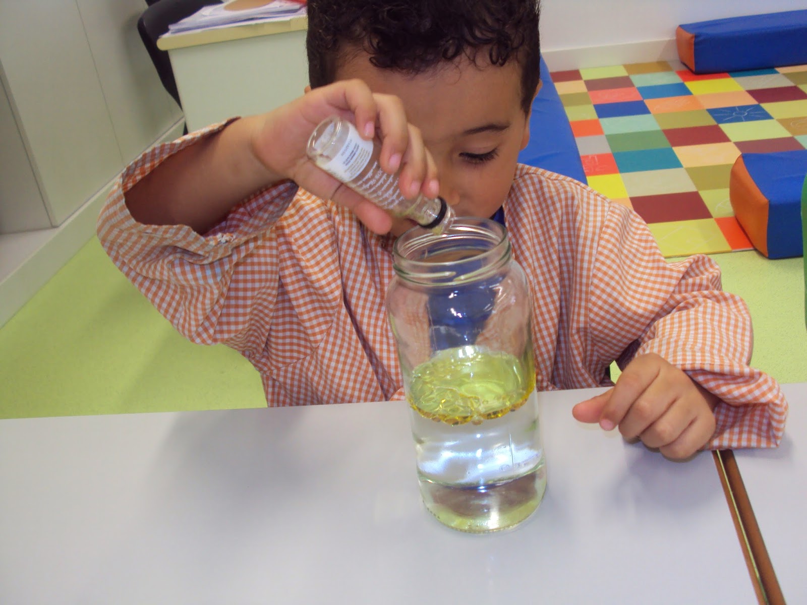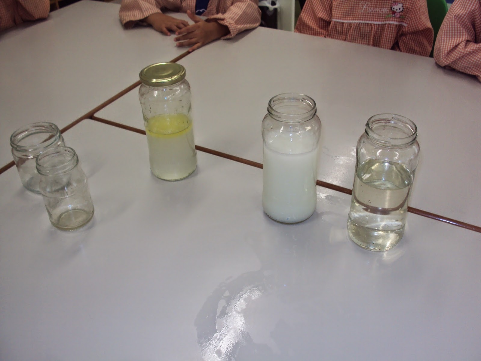 Gostamos de fazer experiências e hoje foi dia de mais uma. Queríamos saber se tudo se mistura com a água como alguns meninos afirmavam que sim. Então arranjamos quatro líquidos diferentes que costumamos usar na nossa alimentação: água, azeite,vinagre e leite. Começámos por levantar as hipóteses. todos os meninos do grupo achavam que o leite, o vinagre e o azeite se misturavam com a água. No final descobrimos que não é isso que acontece