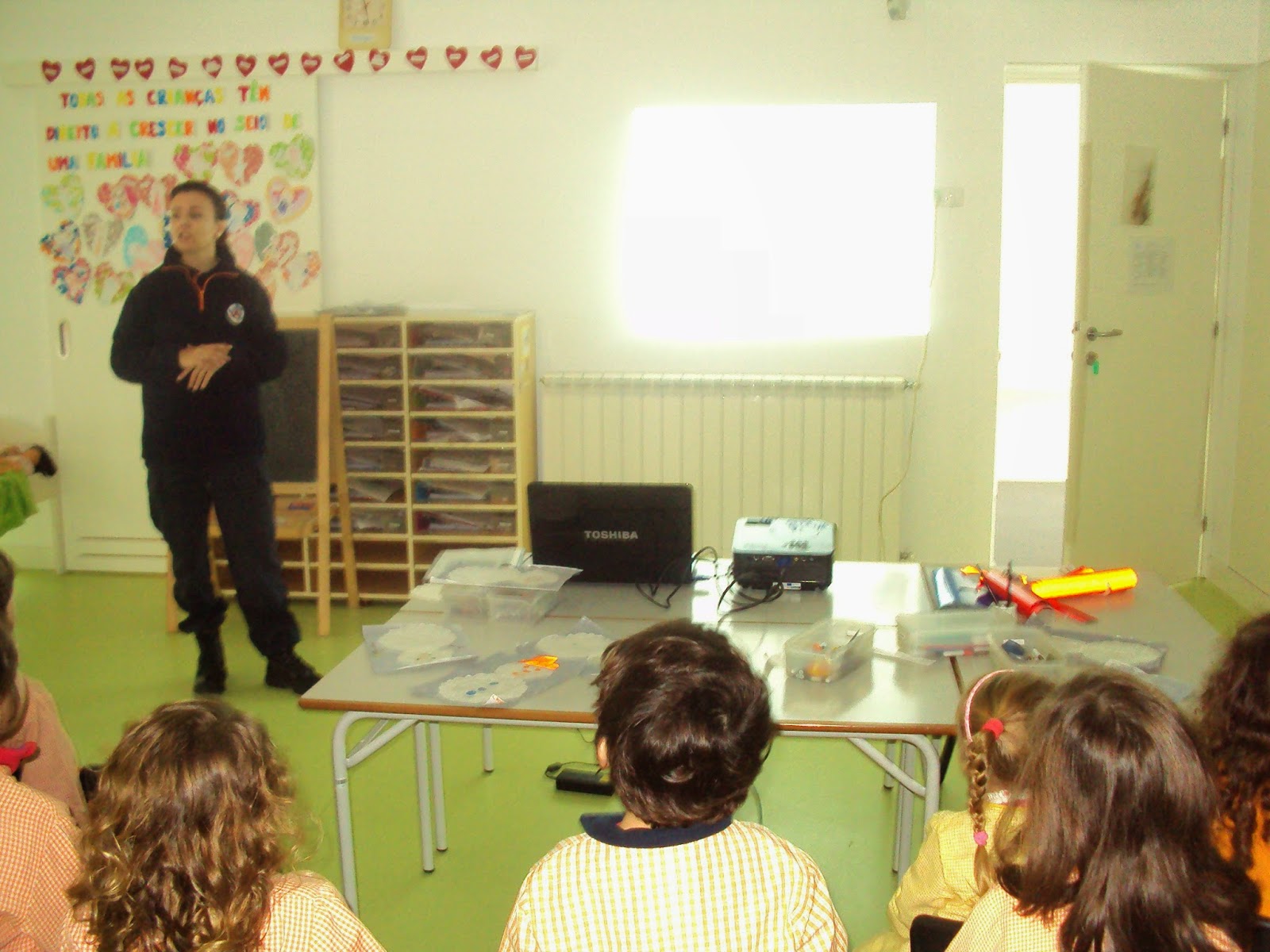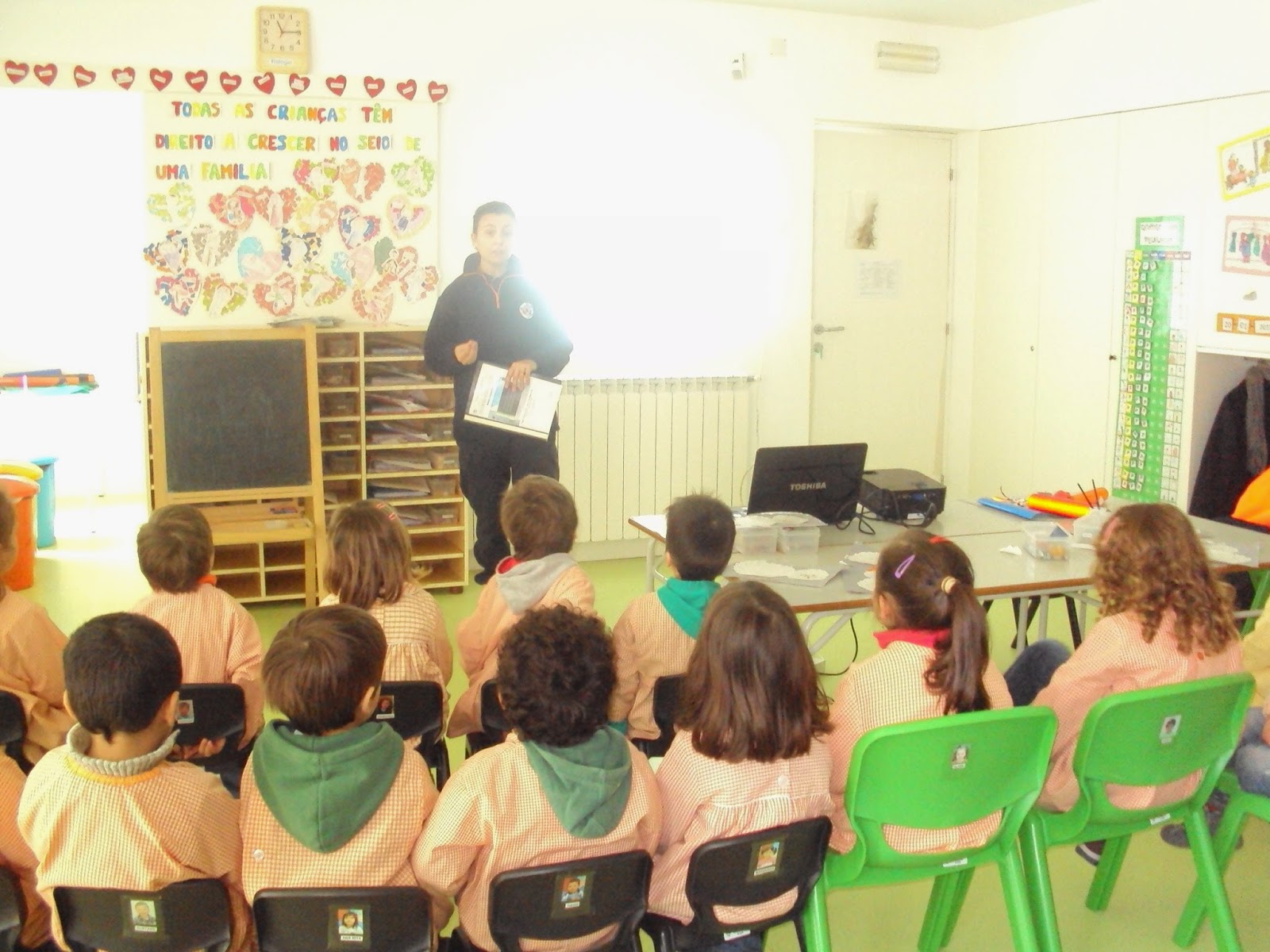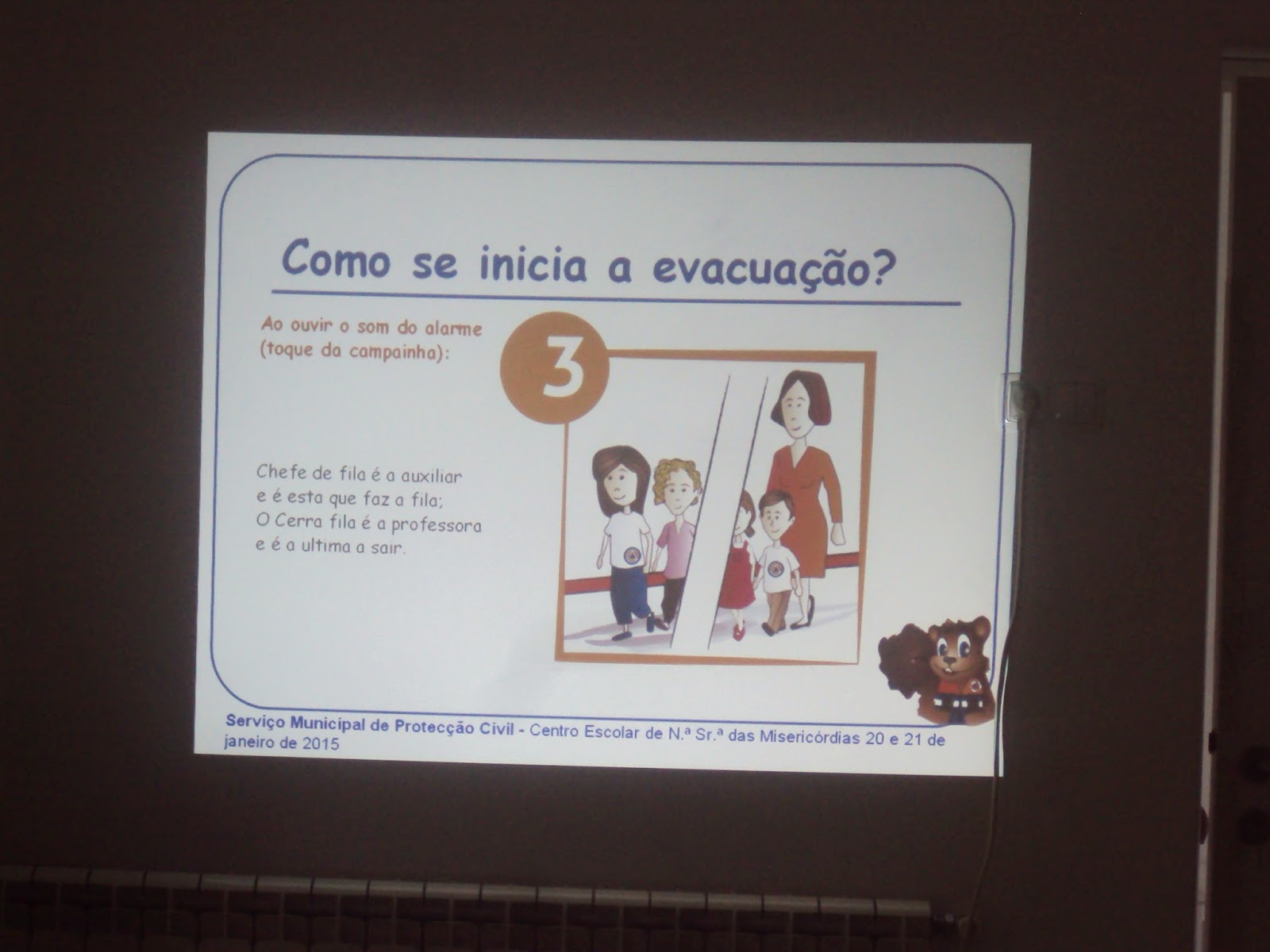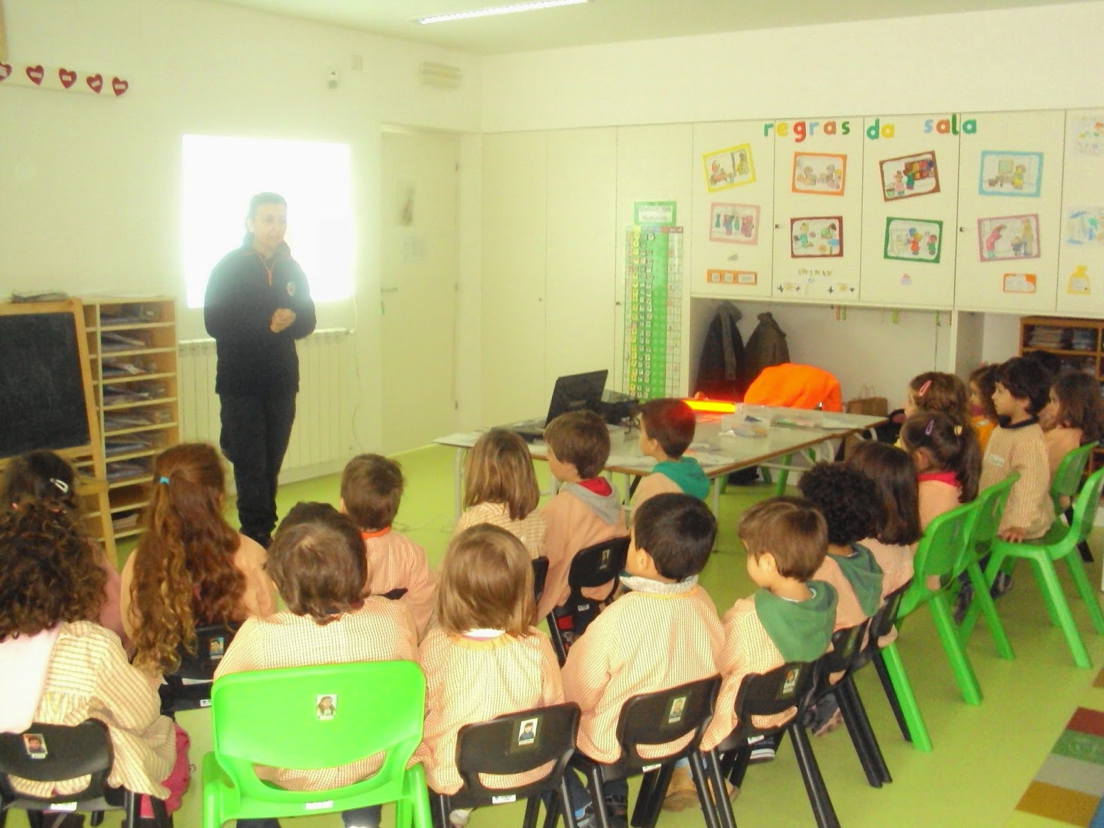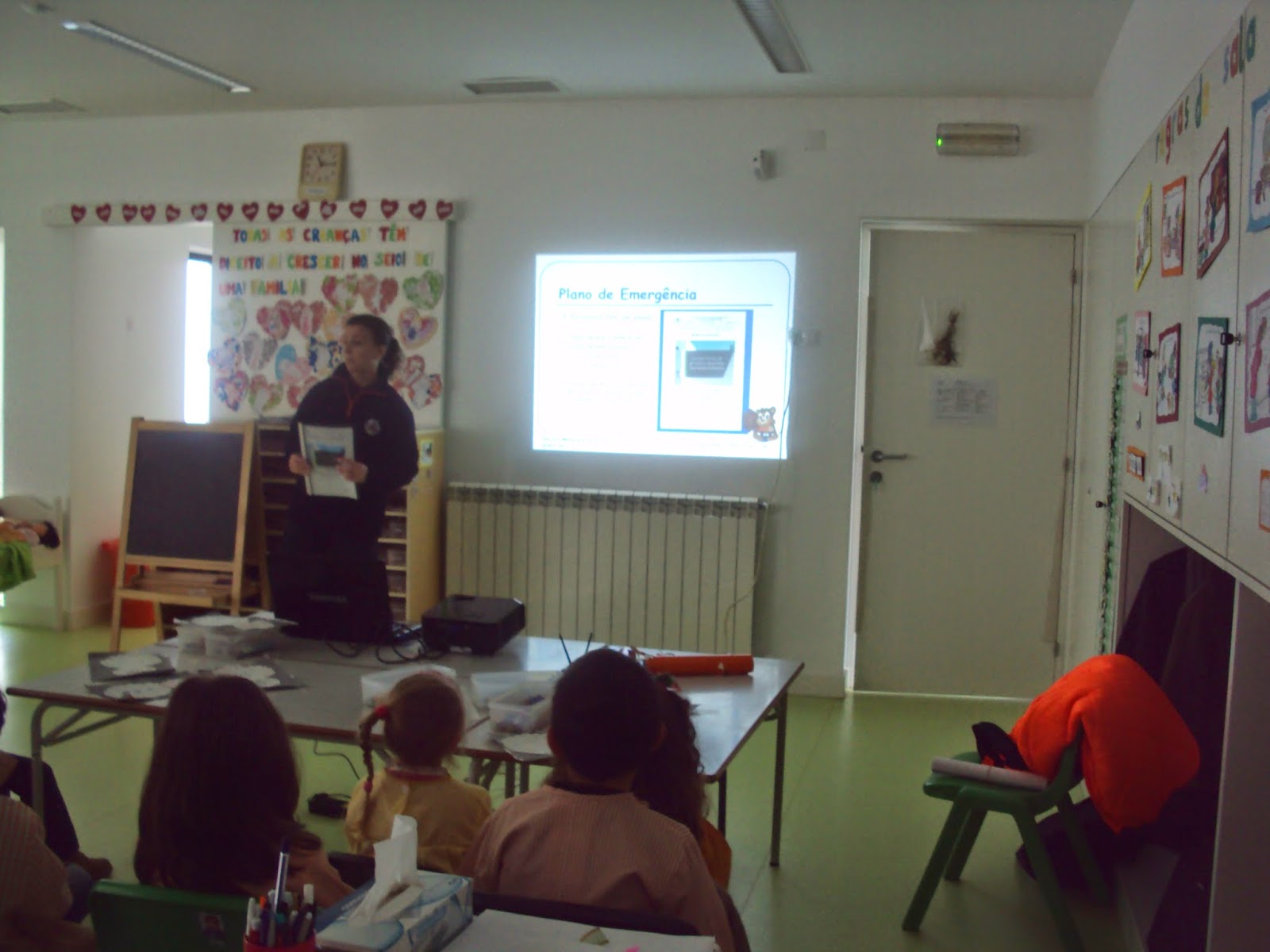 Hoje recebemos na nossa sala uma Senhora do Serviço Municipal de Proteção Civil de Ourém que nos veio de falar de como devemos evacuar da nossa sala, em segurança em caso de catástrofe. Mostrou-nos uma apresentação e um filme sobre estas situações e conversou connosco sobre o que é o Plano de emergência. Estivemos muito atentos e daqui a pouco tempo vamos experimentar na prática os exercícios de evacuação.Gostámos muito e agradecemos à Proteção Civil de Ourém esta ação de sensibilização.