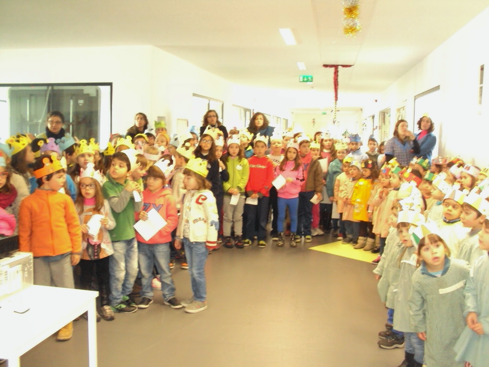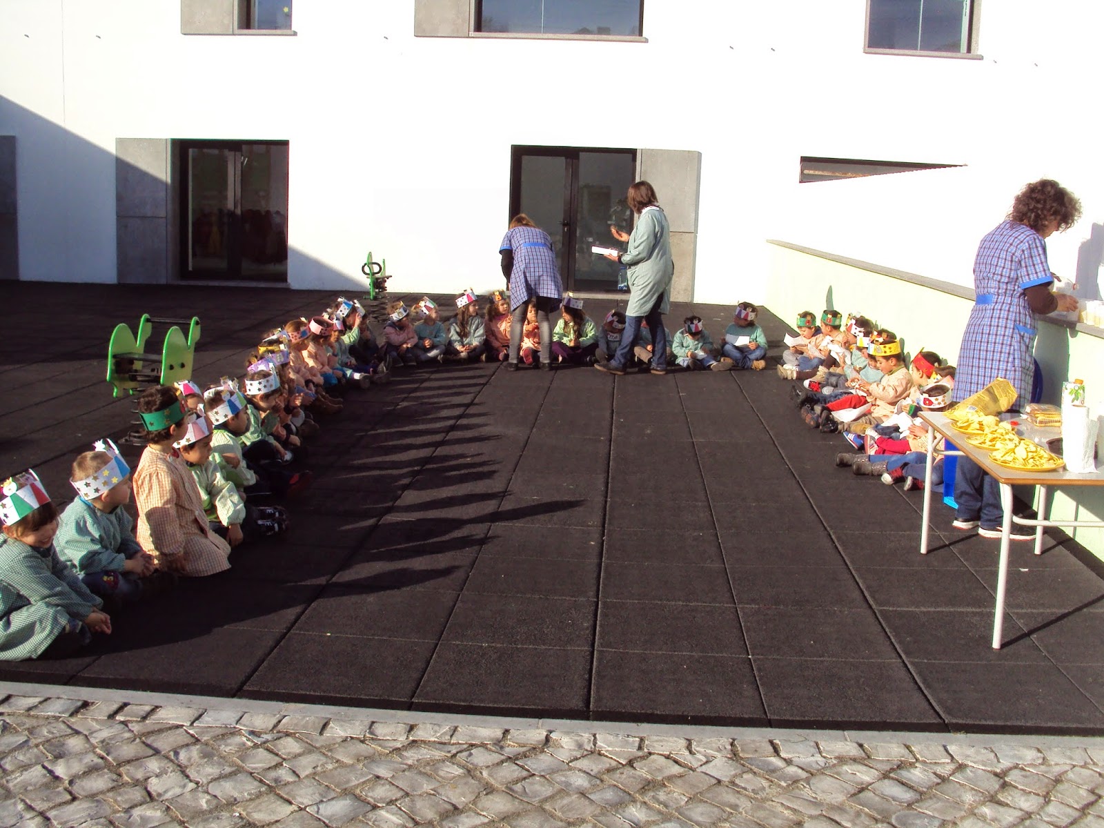 Logo de manhã, depois dos bons dias, das novidades e da marcação das presenças fomos ter a nossa aula de expressão musical, como acontece todas as terças feiras. Depois terminámos as nossas coroas, lanchámos e brincámos na rua. À tarde, como não podia deixar de ser, juntá-mo-nos com todos os nossos amigos do Centro Escolar e festejámos o Dia de Reis. Os meninos do pré-escolar cantaram uma canção dos Reis para os amigos do 1º CEB que retribuíram com outra canção que cantaram para o pré-escolar. De seguida a professora Albertina mostrou-nos uma apresentação sobre os Reis Magos e as tradições associadas a este dia, em diferentes países. Tivemos um lanche diferente, na rua e brincámos.