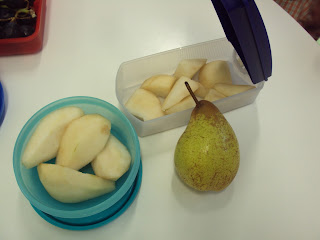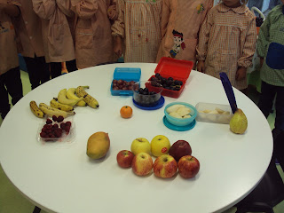 Hoje voltamos a comer fruta ao lanche da manhã. O conjunto de frutos mais numeroso foi o das pêras e apareceram dois frutos diferentes de ontem...um pêssego e uma romã. Depois do lanche vimos a história da "...menina que não gostava de fruta". ``A tarde fomos à biblioteca como vai ser habitual todas as terças feiras a partir de hoje. Antes de escolhermos e requisitarmos livros para levarmos para casa, vimos uma roda dos alimentos que a prof. Raquelina preparou para nóse conversamos sobre a roda dos alimentos. Ainda escutámos a leitura da história da "Galinha Ruiva" e depois cada um escolheu um livro para levar para casa. Mas o nosso dia ainda teve outras atividades, recebemos uma menina nova que começou hoje a frequentar a nossa sala, brincámos na sala nas diferentes áreas de atividade e demos umas magnificas corridas no espaço exterior quando o sol apareceu.
