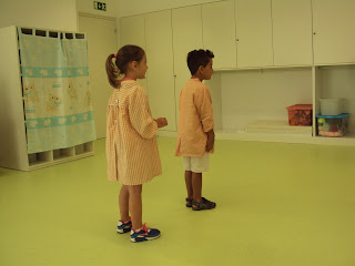 ...vamos aproveitando para fazer atividades e brincadeiras ao ar livre. Dentro da sala vamos estabelecendo as rotinas tão importantes para transmitir segurança e bem estar. As regras de funcionamento foram combinadas conjuntamente e a pouco e pouco vão sendo interiorizadas e cumpridas. Nestes primeiros dias também há alguma flexibilidade afinal estamos todos, todos os dias a aprender. Os meninos e meninas novas começam a sentir-se parte do grupo, são muito autónomos e participativos. Os dias vão fluindo com calma, alegria e muita brincadeira. Ir à areia é sempre uma atividade que todos gostam, mesmo os "poucos" que não se querem descalçar gostam da sensação de brincar na areia. Hoje misturámos água na areia seca e assim se conseguiu fazer "coisas como na praia". São estas coisas simples e agradáveis que são verdadeiramente importantes e que vão contribuindo para o desenvolvimento integral de cada criança. À tarde, na sala ouvimos a história "O abraço perfeito" e tal como o ursinho demos abraços uns aos outros para descobrir qual o abraço perfeito. A conclusão foi que o abraço perfeito é o do pai e da mãe mas o dos amigos também é muito bom.