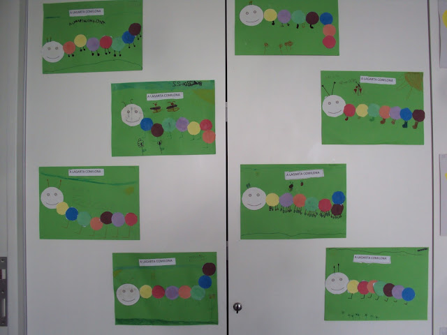 Oito meninos e meninas de 5 anos (ou quase). Tesouras, folhas de papel, colas e 64 círculos de diferentes tamanhos e cores. O desafio era cada criança construir a sua lagarta comilona e tinham de ser todas diferentes umas das outras. Cada criança tinha de recortar 8 círculos de cores diferentes e depois formar a sua lagarta. O desafio foi concretizado com sucesso.