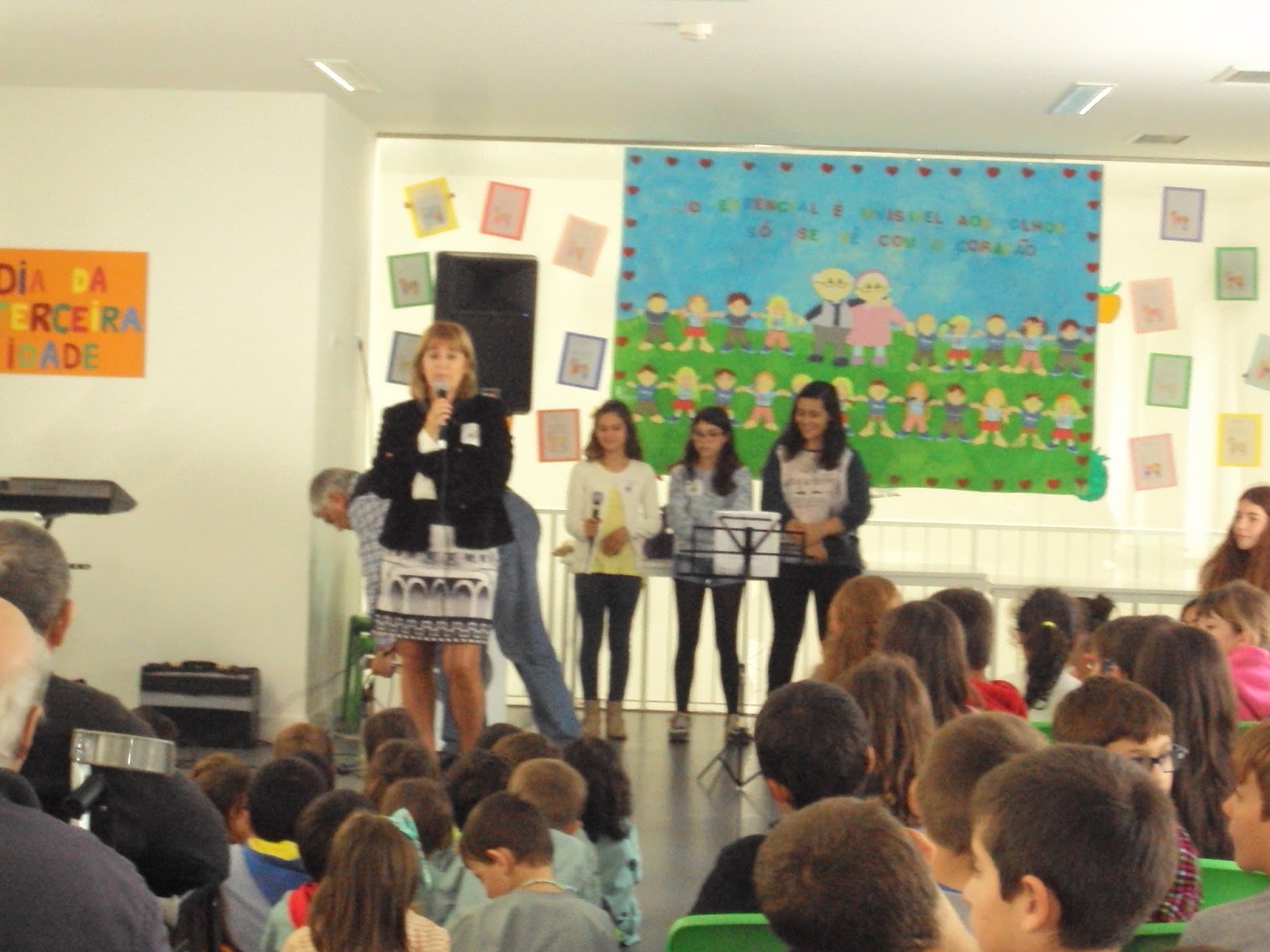 Foi para assinalar esta realidade que hoje tivemos no nosso centro escolar uns convidados muito especiais...um grupo de idosos que frequentam o Centro Social do Divino Espírito Santo, com sede na Lagoa do Furadouro. Vieram passar connosco algum do seu tempo, num clima de descontração e alegria. Esta atividade, que mobilizou todo o Centro escolar, foi enriquecida pela colaboração do clube de música da escola sede do nosso agrupamento (EB 2,3 IV Conde de Ourém), com a presença da equipa do projeto Agir (alunos, docentes e outros técnicos também afetos à nossa escola sede) e com a presença de duas AO (obrigada Patrícia e São) que nos divertiram com o espetáculo que nos apresentaram. Agradecemos ainda a presença da Srª Diretora do nosso agrupamento que também esteve presente. Acreditamos que é nesta união de esforços que podemos fazer a diferença e chamar a atenção dos nossos alunos para a realidade das pessoas idosas e dos direitos que lhe estão consagrados mas são tantas vezes esquecidos. Obrigado a todos!