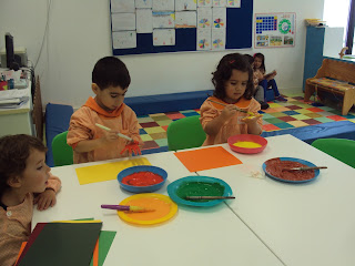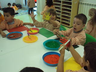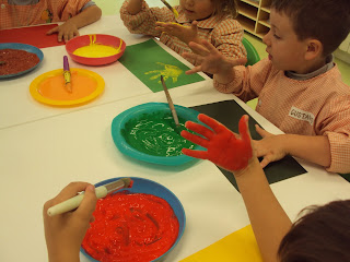 No nosso dia a dia explorar os diferentes materiais é algo muito natural. A propósito de um trabalho coletivo que estamos a preparar, relacionado com o outono, hoje foi dia de carimbar com as mãos. Grandes e pequenos experimentaram pintar as mãos e deixar a sua marca na cartolina. Foram vividas diferentes sensações mais agradáveis para uns do que para outros mas ...somos todos diferentes!