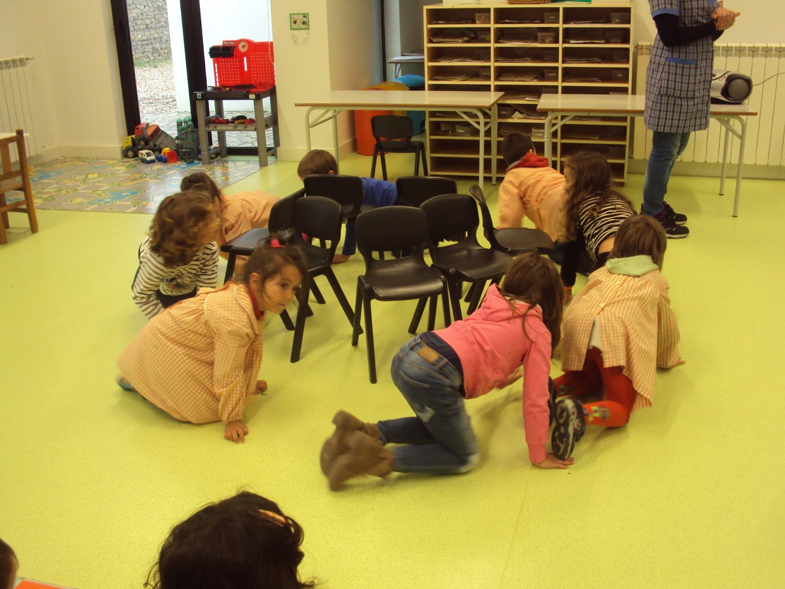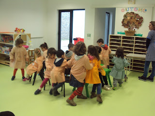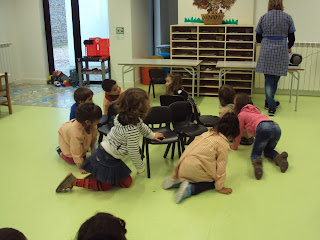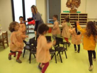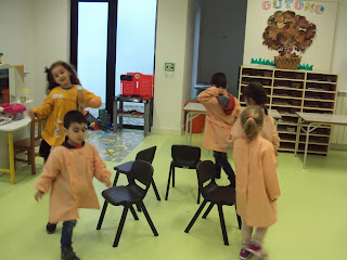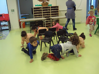 Na nossa sala a atividade física é tão importante é tão importante como qualquer outra atividade. Com tanta chuva é impossível vir à rua mas dentro da sala também podemos fazer diversos jogos em que nos movimentamos, desenvolvemos a psicomotricidade e ainda por cima nos divertimos. Hoje fizemos o jogo das cadeiras, primeiro a andar como é habitual, depois a correr e por fim a andar de gatas. Foi muito divertido e quem não gosta de perder também aprende a fazê-lo!
