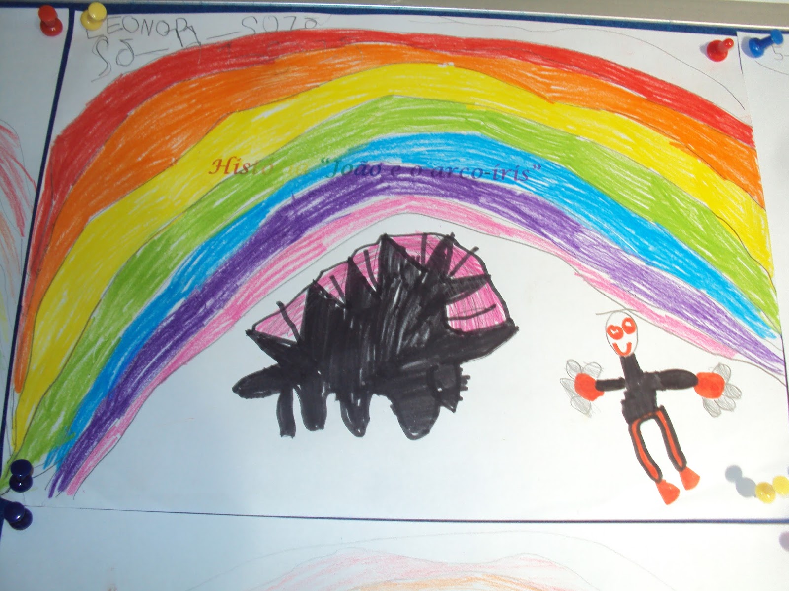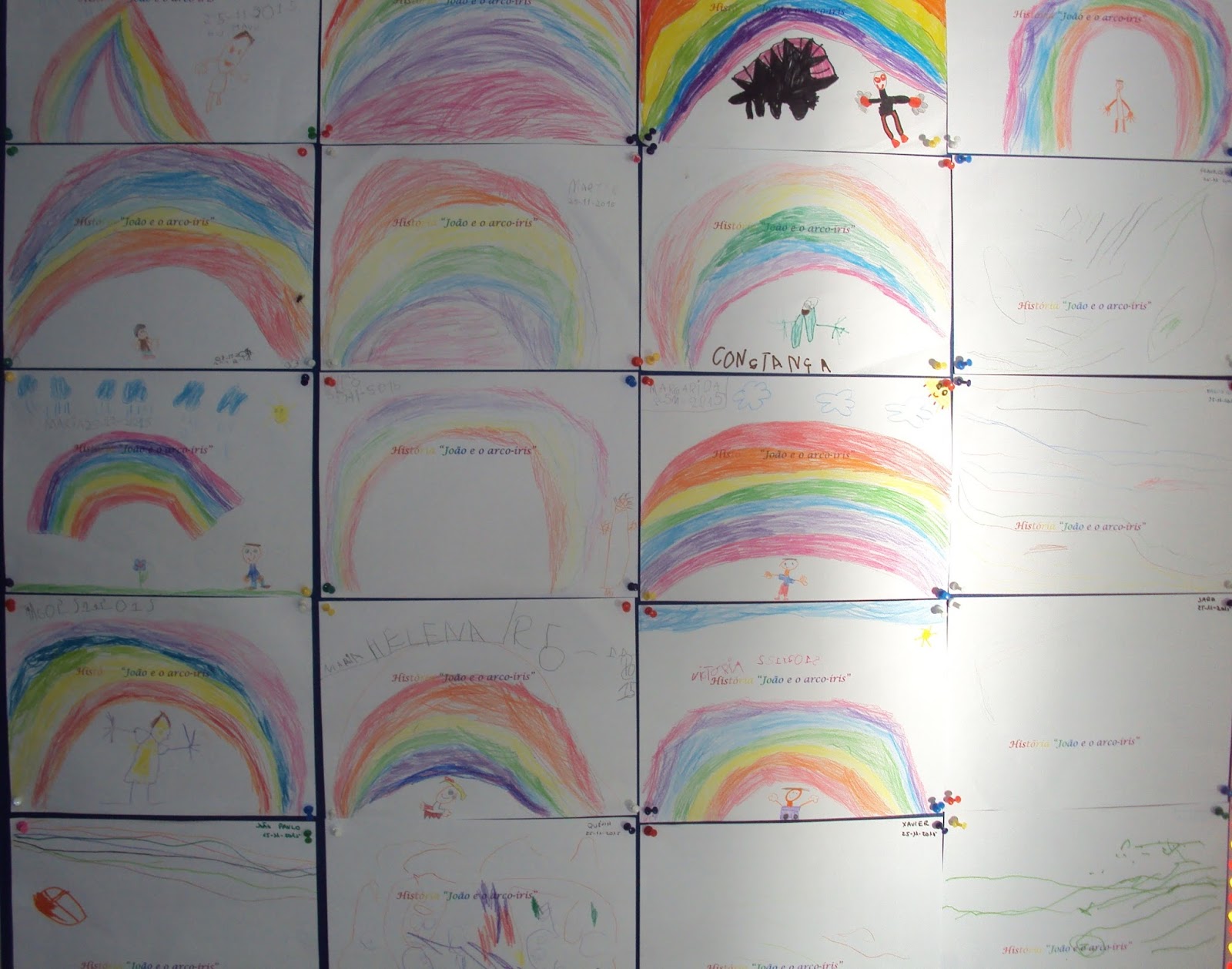 Todos os dias exploramos uma história. A do dia de ontem chama-se "João e o arco-íris". Primeiro estivemos muito atentos a ouvir ler a história e a observar as imagens. Depois de conversarmos sobre o que aconteceu na história, quem entra na história, onde se passa a história foi a vez do desafio. Fazer o João e o seu arco-íris. Grandes, médios e pequenos corresponderam ao desafio. Pensou-se em cores, em sete cores, no seu nome e na sua sequência. Os mais pequenos mostraram-nos a sua visão que embora seja diferente é também muito significativa