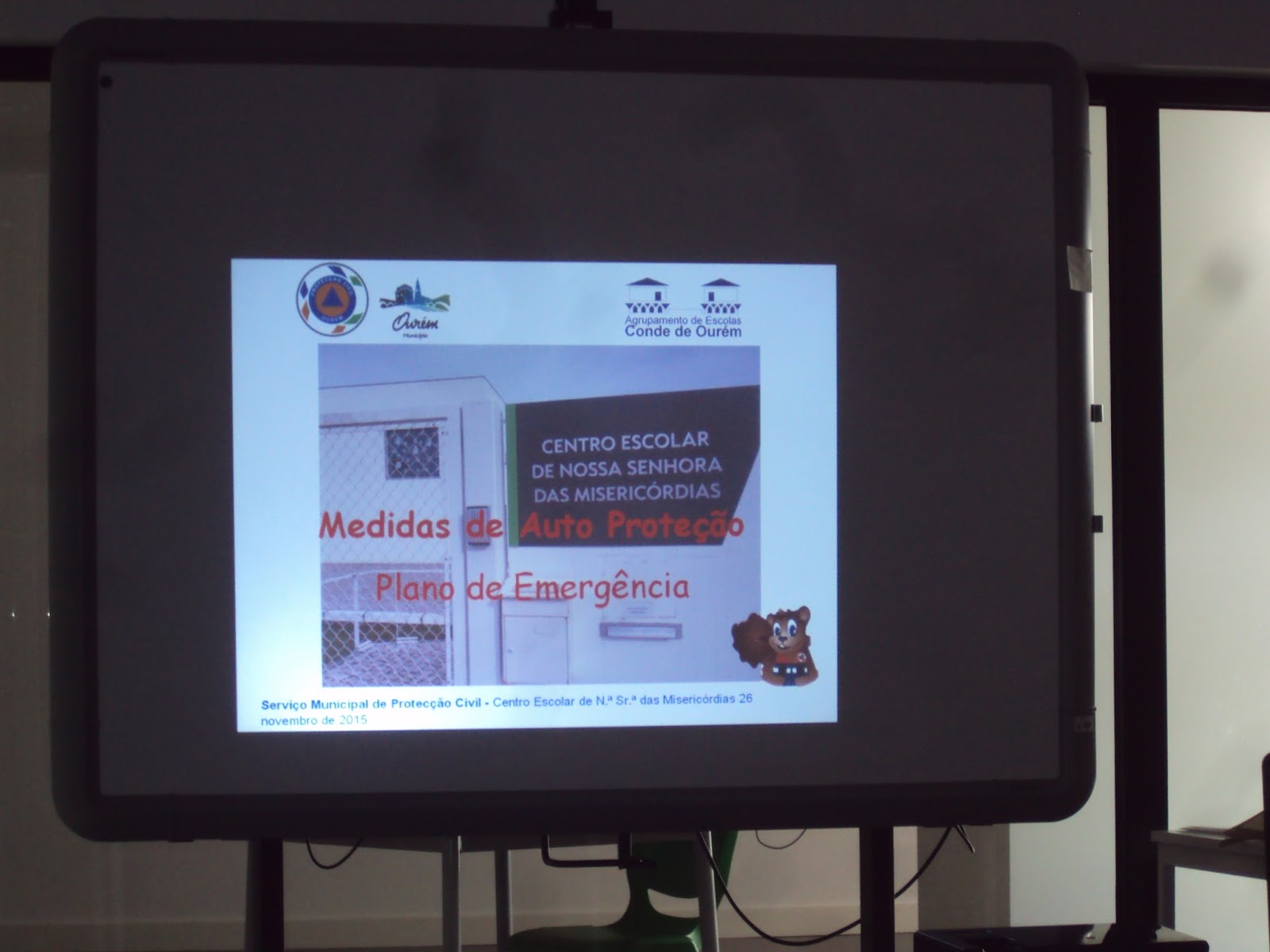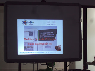 E hoje esteve no nosso centro escolar uma senhora do Serviço Municipal de Proteção Civil de Ourém que nos veio falar da forma como devemos proceder, para nos protegermos, em caso de sismo ou de incêndio. Algumas crianças ainda se lembravam das medidas essenciais mas para os meninos que estão de novo foi importante conhecerem estas regras de auto proteção.