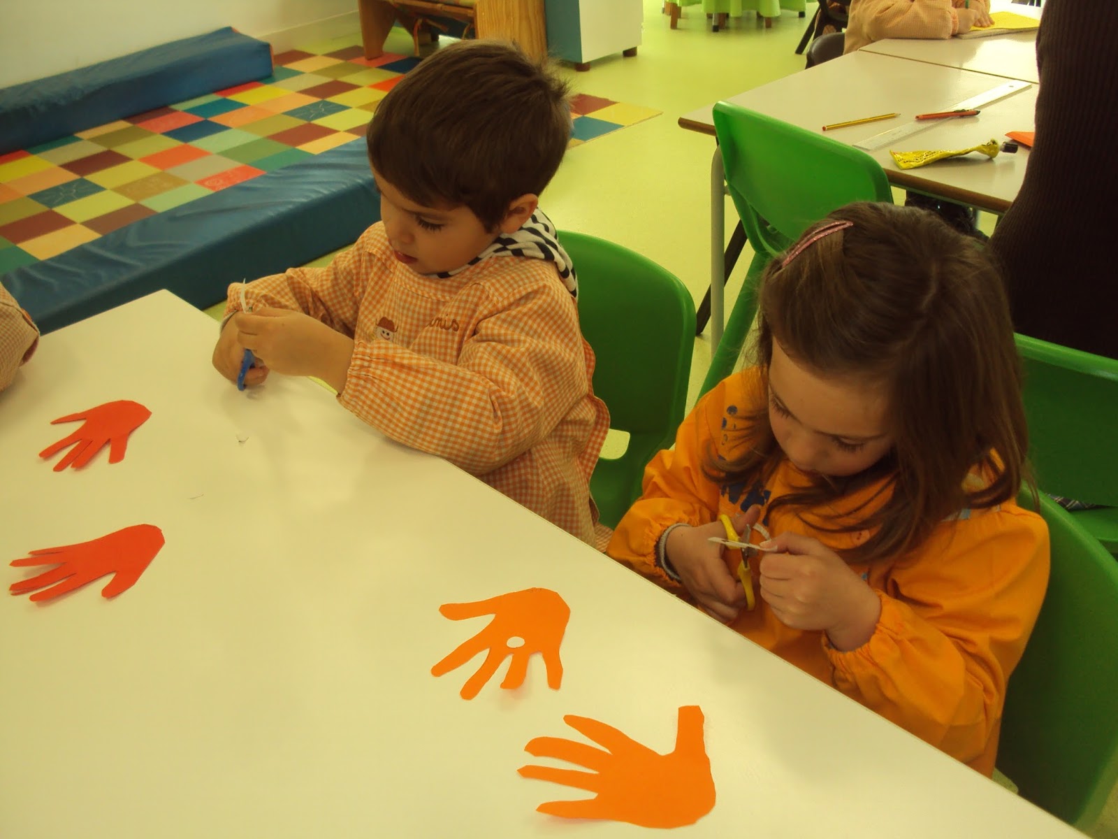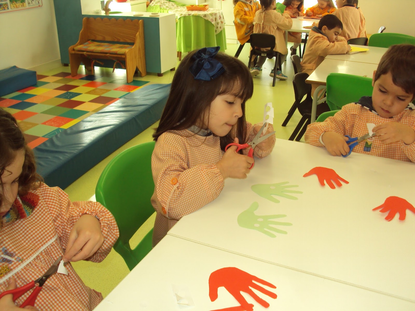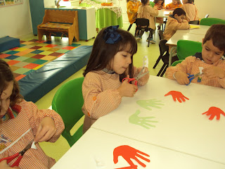 Hoje começámos a ser invadidos por uns coelhinhos divertidos feito a a partir do contorno da mão de cada um. Cada menino/a fez um par pois utilizou a mão direita e a mão esquerda e apesar de ser um trabalho um bocadinho difícil (cortar por cima da linha nem sempre é uma tarefa fácil) os/as meninos/as responderam muito bem ao desafio. Assim se treina a motricidade fina e se preparam as mãos para a escrita que virá depois...cada coisa a seu tempo